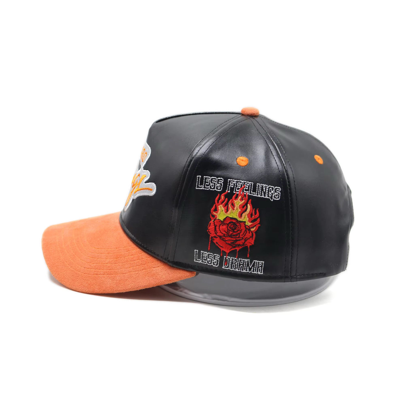 Introducing our No Hard Feelings Vegan Leather SnapBack. Made with high-quality vegan leather and a soft suede brim, this stylish hat features our embroidered "less Feelings, less drama" logo on one side and the Baltimore signature on the other. Show off your authenticity and make a statement with our fashionable hat.